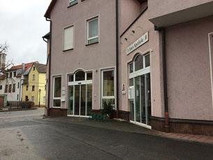 Zu Fuß können Sie dann nach nur 20 Metern direkt ebenerdig in die Praxis gehen, wenn Sie am Eingang den Türöffner (rechts) drücken.